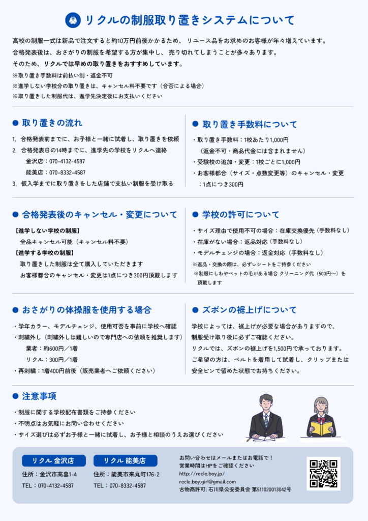 近年はリユース制服を希望される方が増え、合格発表後は売り切れが続出しています。