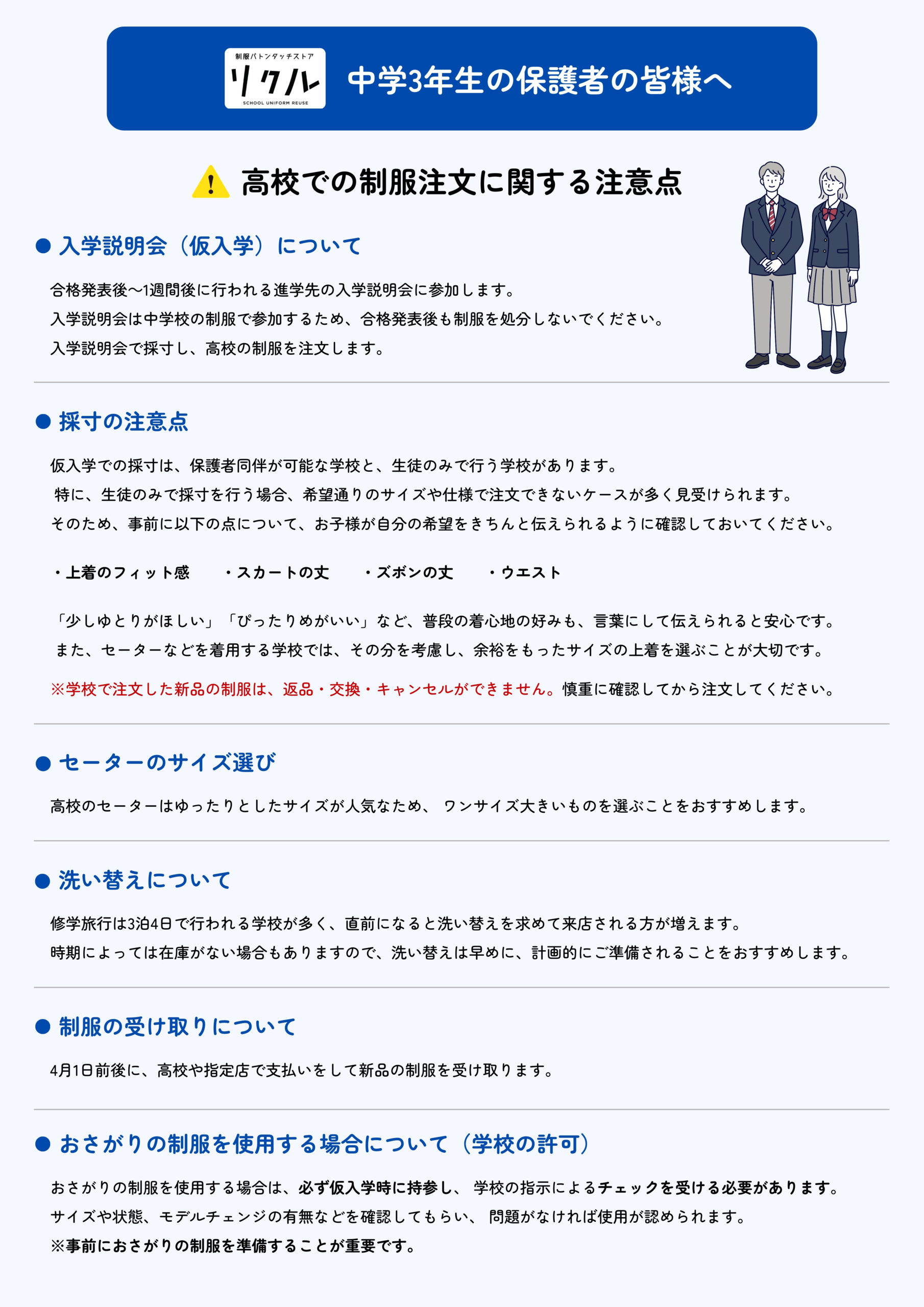 受験予定の高校の制服に限り、取り置きをお受けしています