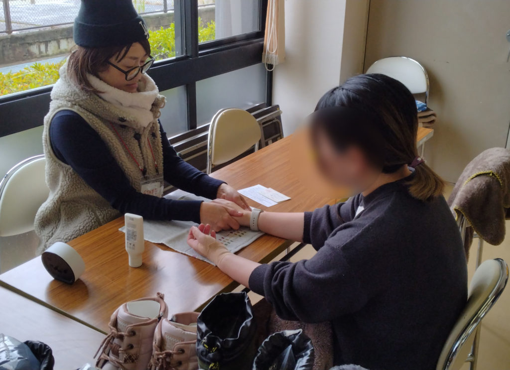 普段はタイ古式マッサージ セラピストのくみちゃんが、親御さんの手を優しくマッサージしてくれました。