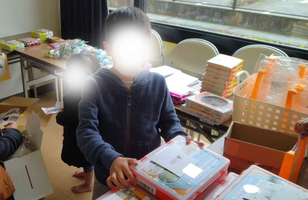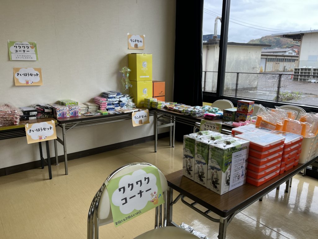 お菓子、おもちゃ、文房具、ランドセル、通園通学バッグ5点セット、雪遊び用手袋、お菓子、などなど、さまざまな子供向けのアイテムがあつまりました。