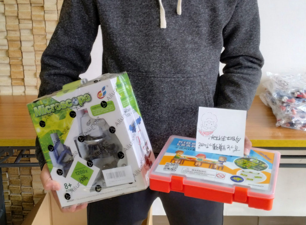 ラムリサーチ様からは、顕微鏡や、科学電気回路学習キットのご提供があり、うれしそうに顕微鏡を手にするお子さんが大勢いらっしゃいました。