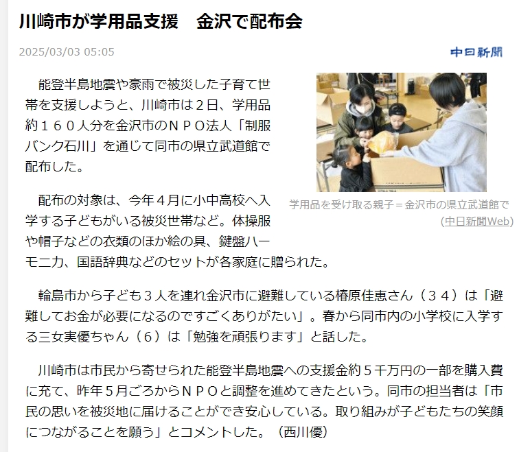 能登半島地震で被災された子育て家庭を対象に、神奈川県川崎市の市民の皆様からの寄附金による「学校用品支援」を実施いたしました。