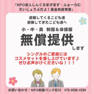 能登半島地震で被災・影響を受けたシングル家庭が安心して生活し学べるように応援する「NPO法人しんぐるまざあず・ふぉーらむ だいじょうぶだよ!基金助成事業」の採択を受け、避難してくるこども達・避難してきたこども達へ 制服や […]
